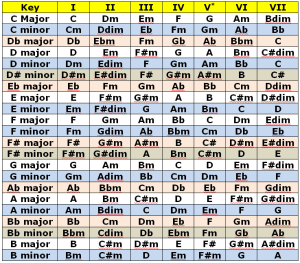 Oh yes – back to tuning, etc. In 16 Tunings mode you can play pretty-much an chord your heart desires, beating even the biggest concert kits in the Toms department. The question is – what notes to play to fit what key? The answer (in a typically generic way) might be here: